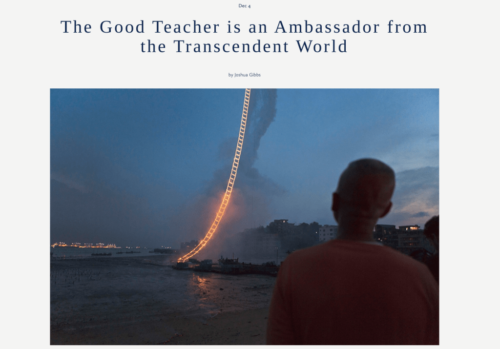 Teacher: A clearly articulated understanding of the spirit of a book. It’s a reader’s ability to delve below appearances and describe how all the disparate elements of a book coalesce into a singular moral vision. A strong reading is an interpretation of all the characters, arguments, images, and themes that brings the moral and spiritual weight of a book to bear on the audience. It is an act of deference to reality. It translates the substance of a text into the light by which we can view our own lives clearly.