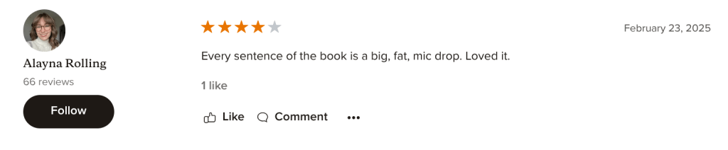 I haven’t read every Goodreads review of my books, but I’ve read quite a few, and this is one of my favorites.