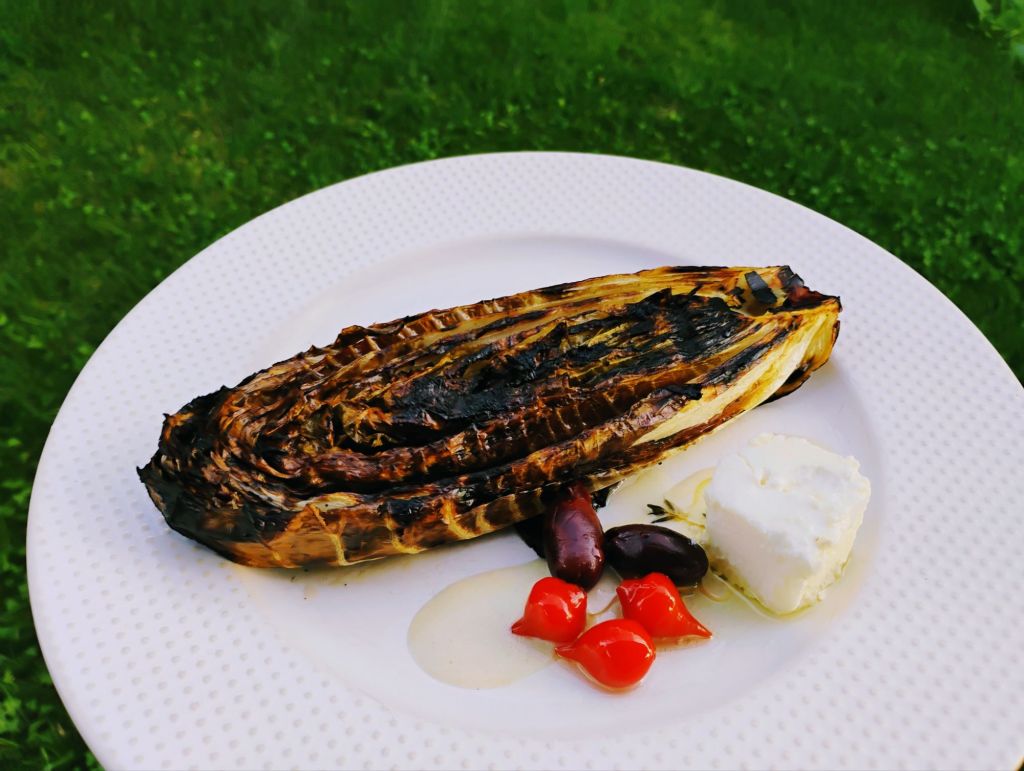 Grilled Radicchio rosso di Treviso with Caesar dressing, Peruvian Pearl peppers, smoked kalamata olives, and goat & sheep’s milk cheese.